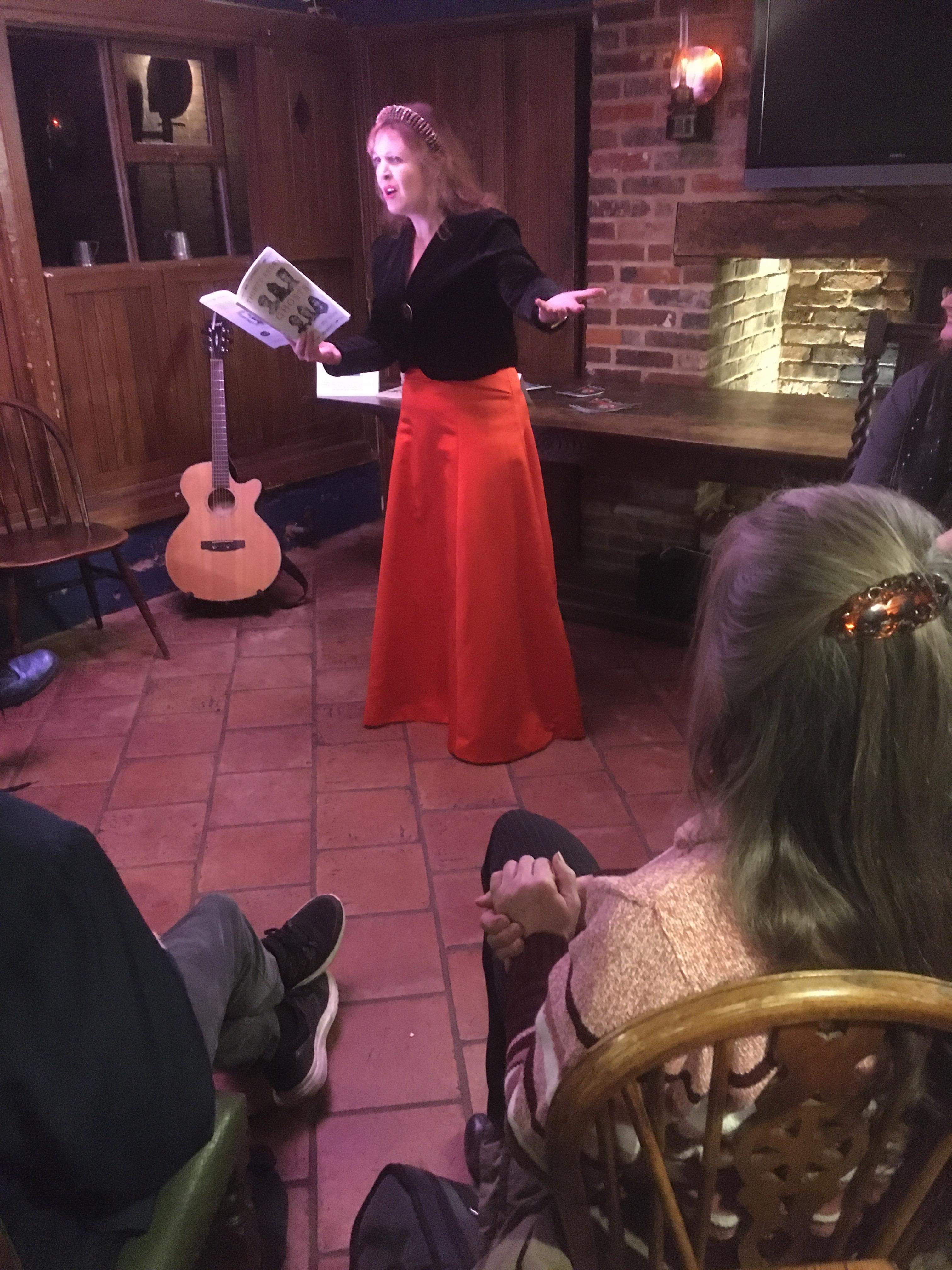Last night I was honoured to play the Ghost of Anne Boleyn in The King’s Head in Woodbridge, reading from the featured Artist’s poetry book, ‘Thirty Angry Ghosts.’ This is an amazing and popular collection, featuring biographies about each ‘ghost.’ It’s great fun and really well-researched. The actors brought the poetry to life last night in this professional even hosted by Justine de Mierre.