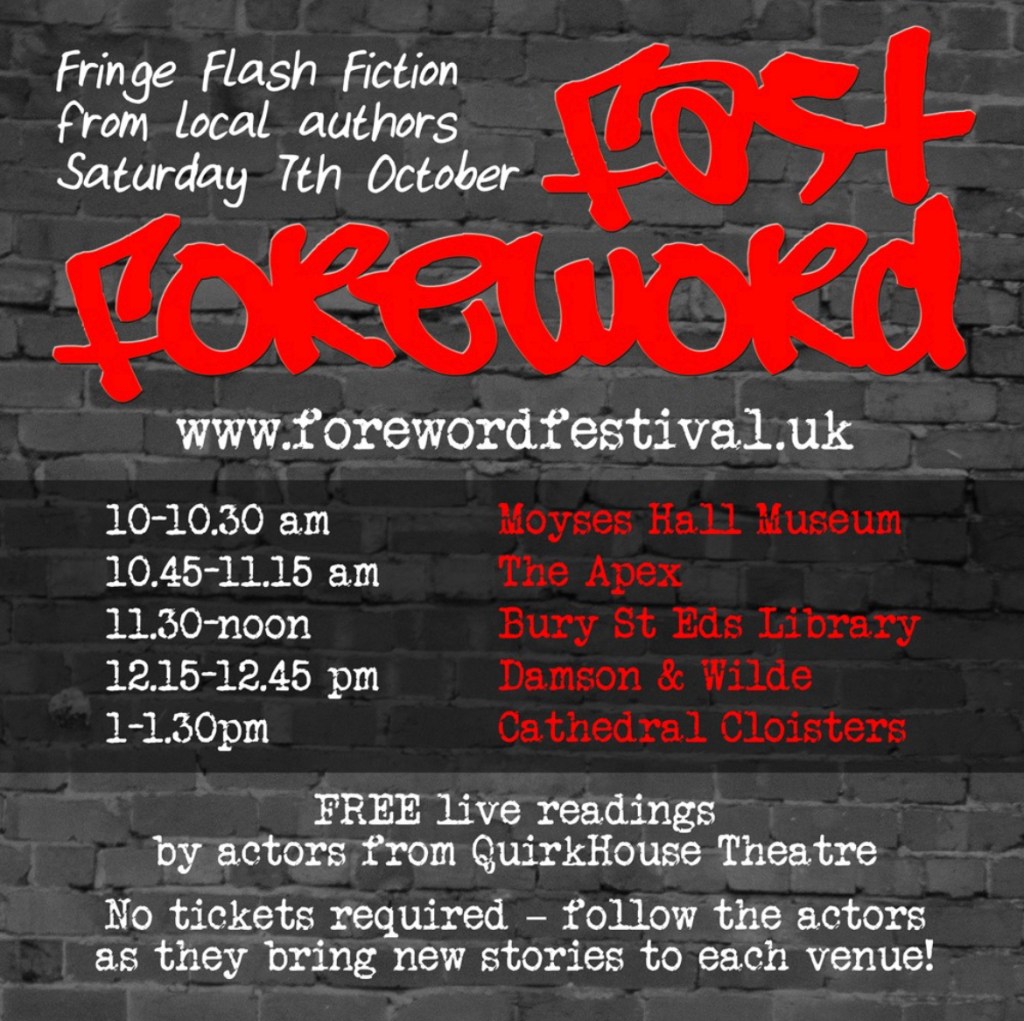 My new flash fiction story, Writer’s Block, a weird and twisty supernatural tale which will resonate with any creator, will be performed by an actor from Quirkhouse Theatre on Saturday 7th October at the Library in Bury St Edmunds, Suffolk. It was one of the winning stories at the first Fringe Festival for the area. Do come and support us local authors and be entertained! My story is between 11am and 12 noon.